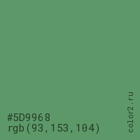 Цвет #5D9968 в цветовой модели RGB обозначается тремя октетами (93, 153, 104) в десятичном формате и #5D9968 в шестнадцатиричном (hex) формате, которые являются интенсивностью красного 93 (hex 5D), интенсивность зелёного 153 (hex 99) и интенсивность синего 104 (hex 68).