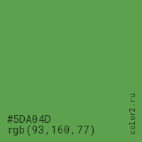 Цвет #5DA04D в цветовой модели RGB обозначается тремя октетами (93, 160, 77) в десятичном формате и #5DA04D в шестнадцатиричном (hex) формате, которые являются интенсивностью красного 93 (hex 5D), интенсивность зелёного 160 (hex A0) и интенсивность синего 77 (hex 4D).