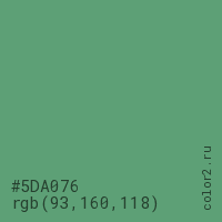 Цвет #5DA076 в цветовой модели RGB обозначается тремя октетами (93, 160, 118) в десятичном формате и #5DA076 в шестнадцатиричном (hex) формате, которые являются интенсивностью красного 93 (hex 5D), интенсивность зелёного 160 (hex A0) и интенсивность синего 118 (hex 76).
