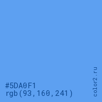 Цвет #5DA0F1 в цветовой модели RGB обозначается тремя октетами (93, 160, 241) в десятичном формате и #5DA0F1 в шестнадцатиричном (hex) формате, которые являются интенсивностью красного 93 (hex 5D), интенсивность зелёного 160 (hex A0) и интенсивность синего 241 (hex F1).