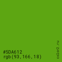 Цвет #5DA612 в цветовой модели RGB обозначается тремя октетами (93, 166, 18) в десятичном формате и #5DA612 в шестнадцатиричном (hex) формате, которые являются интенсивностью красного 93 (hex 5D), интенсивность зелёного 166 (hex A6) и интенсивность синего 18 (hex 12).