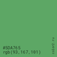 Цвет #5DA765 в цветовой модели RGB обозначается тремя октетами (93, 167, 101) в десятичном формате и #5DA765 в шестнадцатиричном (hex) формате, которые являются интенсивностью красного 93 (hex 5D), интенсивность зелёного 167 (hex A7) и интенсивность синего 101 (hex 65).