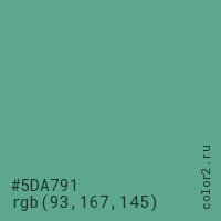 Цвет #5DA791 в цветовой модели RGB обозначается тремя октетами (93, 167, 145) в десятичном формате и #5DA791 в шестнадцатиричном (hex) формате, которые являются интенсивностью красного 93 (hex 5D), интенсивность зелёного 167 (hex A7) и интенсивность синего 145 (hex 91).