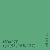 Цвет #5DA87F в цветовой модели RGB обозначается тремя октетами (93, 168, 127) в десятичном формате и #5DA87F в шестнадцатиричном (hex) формате, которые являются интенсивностью красного 93 (hex 5D), интенсивность зелёного 168 (hex A8) и интенсивность синего 127 (hex 7F).