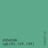 Цвет #5DA98B в цветовой модели RGB обозначается тремя октетами (93, 169, 139) в десятичном формате и #5DA98B в шестнадцатиричном (hex) формате, которые являются интенсивностью красного 93 (hex 5D), интенсивность зелёного 169 (hex A9) и интенсивность синего 139 (hex 8B).