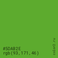 Цвет #5DAB2E в цветовой модели RGB обозначается тремя октетами (93, 171, 46) в десятичном формате и #5DAB2E в шестнадцатиричном (hex) формате, которые являются интенсивностью красного 93 (hex 5D), интенсивность зелёного 171 (hex AB) и интенсивность синего 46 (hex 2E).