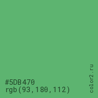 Цвет #5DB470 в цветовой модели RGB обозначается тремя октетами (93, 180, 112) в десятичном формате и #5DB470 в шестнадцатиричном (hex) формате, которые являются интенсивностью красного 93 (hex 5D), интенсивность зелёного 180 (hex B4) и интенсивность синего 112 (hex 70).