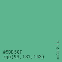 Цвет #5DB58F в цветовой модели RGB обозначается тремя октетами (93, 181, 143) в десятичном формате и #5DB58F в шестнадцатиричном (hex) формате, которые являются интенсивностью красного 93 (hex 5D), интенсивность зелёного 181 (hex B5) и интенсивность синего 143 (hex 8F).