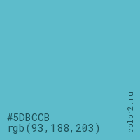 Цвет #5DBCCB в цветовой модели RGB обозначается тремя октетами (93, 188, 203) в десятичном формате и #5DBCCB в шестнадцатиричном (hex) формате, которые являются интенсивностью красного 93 (hex 5D), интенсивность зелёного 188 (hex BC) и интенсивность синего 203 (hex CB).