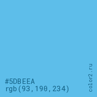 Цвет #5DBEEA в цветовой модели RGB обозначается тремя октетами (93, 190, 234) в десятичном формате и #5DBEEA в шестнадцатиричном (hex) формате, которые являются интенсивностью красного 93 (hex 5D), интенсивность зелёного 190 (hex BE) и интенсивность синего 234 (hex EA).