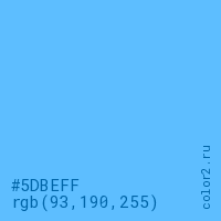 Цвет #5DBEFF в цветовой модели RGB обозначается тремя октетами (93, 190, 255) в десятичном формате и #5DBEFF в шестнадцатиричном (hex) формате, которые являются интенсивностью красного 93 (hex 5D), интенсивность зелёного 190 (hex BE) и интенсивность синего 255 (hex FF).