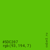 Цвет #5DC207 в цветовой модели RGB обозначается тремя октетами (93, 194, 7) в десятичном формате и #5DC207 в шестнадцатиричном (hex) формате, которые являются интенсивностью красного 93 (hex 5D), интенсивность зелёного 194 (hex C2) и интенсивность синего 7 (hex 07).
