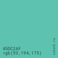 Цвет #5DC2AF в цветовой модели RGB обозначается тремя октетами (93, 194, 175) в десятичном формате и #5DC2AF в шестнадцатиричном (hex) формате, которые являются интенсивностью красного 93 (hex 5D), интенсивность зелёного 194 (hex C2) и интенсивность синего 175 (hex AF).