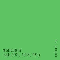 Цвет #5DC363 в цветовой модели RGB обозначается тремя октетами (93, 195, 99) в десятичном формате и #5DC363 в шестнадцатиричном (hex) формате, которые являются интенсивностью красного 93 (hex 5D), интенсивность зелёного 195 (hex C3) и интенсивность синего 99 (hex 63).