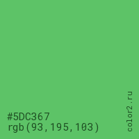 Цвет #5DC367 в цветовой модели RGB обозначается тремя октетами (93, 195, 103) в десятичном формате и #5DC367 в шестнадцатиричном (hex) формате, которые являются интенсивностью красного 93 (hex 5D), интенсивность зелёного 195 (hex C3) и интенсивность синего 103 (hex 67).