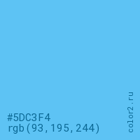 Цвет #5DC3F4 в цветовой модели RGB обозначается тремя октетами (93, 195, 244) в десятичном формате и #5DC3F4 в шестнадцатиричном (hex) формате, которые являются интенсивностью красного 93 (hex 5D), интенсивность зелёного 195 (hex C3) и интенсивность синего 244 (hex F4).
