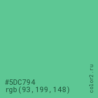 Цвет #5DC794 в цветовой модели RGB обозначается тремя октетами (93, 199, 148) в десятичном формате и #5DC794 в шестнадцатиричном (hex) формате, которые являются интенсивностью красного 93 (hex 5D), интенсивность зелёного 199 (hex C7) и интенсивность синего 148 (hex 94).