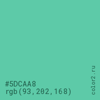 Цвет #5DCAA8 в цветовой модели RGB обозначается тремя октетами (93, 202, 168) в десятичном формате и #5DCAA8 в шестнадцатиричном (hex) формате, которые являются интенсивностью красного 93 (hex 5D), интенсивность зелёного 202 (hex CA) и интенсивность синего 168 (hex A8).