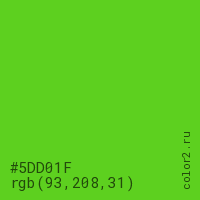Цвет #5DD01F в цветовой модели RGB обозначается тремя октетами (93, 208, 31) в десятичном формате и #5DD01F в шестнадцатиричном (hex) формате, которые являются интенсивностью красного 93 (hex 5D), интенсивность зелёного 208 (hex D0) и интенсивность синего 31 (hex 1F).