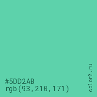 Цвет #5DD2AB в цветовой модели RGB обозначается тремя октетами (93, 210, 171) в десятичном формате и #5DD2AB в шестнадцатиричном (hex) формате, которые являются интенсивностью красного 93 (hex 5D), интенсивность зелёного 210 (hex D2) и интенсивность синего 171 (hex AB).