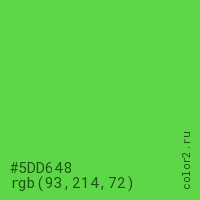 Цвет #5DD648 в цветовой модели RGB обозначается тремя октетами (93, 214, 72) в десятичном формате и #5DD648 в шестнадцатиричном (hex) формате, которые являются интенсивностью красного 93 (hex 5D), интенсивность зелёного 214 (hex D6) и интенсивность синего 72 (hex 48).