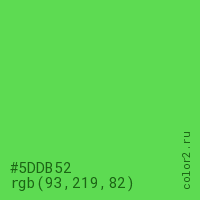 Цвет #5DDB52 в цветовой модели RGB обозначается тремя октетами (93, 219, 82) в десятичном формате и #5DDB52 в шестнадцатиричном (hex) формате, которые являются интенсивностью красного 93 (hex 5D), интенсивность зелёного 219 (hex DB) и интенсивность синего 82 (hex 52).