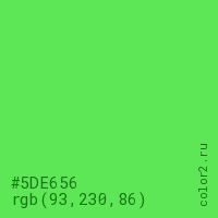 Цвет #5DE656 в цветовой модели RGB обозначается тремя октетами (93, 230, 86) в десятичном формате и #5DE656 в шестнадцатиричном (hex) формате, которые являются интенсивностью красного 93 (hex 5D), интенсивность зелёного 230 (hex E6) и интенсивность синего 86 (hex 56).