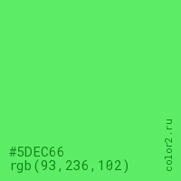 Цвет #5DEC66 в цветовой модели RGB обозначается тремя октетами (93, 236, 102) в десятичном формате и #5DEC66 в шестнадцатиричном (hex) формате, которые являются интенсивностью красного 93 (hex 5D), интенсивность зелёного 236 (hex EC) и интенсивность синего 102 (hex 66).