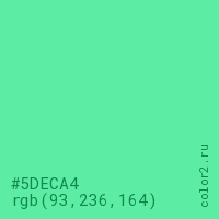 Цвет #5DECA4 в цветовой модели RGB обозначается тремя октетами (93, 236, 164) в десятичном формате и #5DECA4 в шестнадцатиричном (hex) формате, которые являются интенсивностью красного 93 (hex 5D), интенсивность зелёного 236 (hex EC) и интенсивность синего 164 (hex A4).