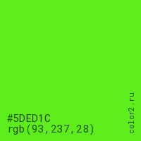 Цвет #5DED1C в цветовой модели RGB обозначается тремя октетами (93, 237, 28) в десятичном формате и #5DED1C в шестнадцатиричном (hex) формате, которые являются интенсивностью красного 93 (hex 5D), интенсивность зелёного 237 (hex ED) и интенсивность синего 28 (hex 1C).