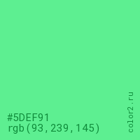 Цвет #5DEF91 в цветовой модели RGB обозначается тремя октетами (93, 239, 145) в десятичном формате и #5DEF91 в шестнадцатиричном (hex) формате, которые являются интенсивностью красного 93 (hex 5D), интенсивность зелёного 239 (hex EF) и интенсивность синего 145 (hex 91).