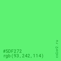 Цвет #5DF272 в цветовой модели RGB обозначается тремя октетами (93, 242, 114) в десятичном формате и #5DF272 в шестнадцатиричном (hex) формате, которые являются интенсивностью красного 93 (hex 5D), интенсивность зелёного 242 (hex F2) и интенсивность синего 114 (hex 72).
