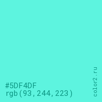 Цвет #5DF4DF в цветовой модели RGB обозначается тремя октетами (93, 244, 223) в десятичном формате и #5DF4DF в шестнадцатиричном (hex) формате, которые являются интенсивностью красного 93 (hex 5D), интенсивность зелёного 244 (hex F4) и интенсивность синего 223 (hex DF).