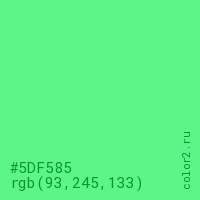 Цвет #5DF585 в цветовой модели RGB обозначается тремя октетами (93, 245, 133) в десятичном формате и #5DF585 в шестнадцатиричном (hex) формате, которые являются интенсивностью красного 93 (hex 5D), интенсивность зелёного 245 (hex F5) и интенсивность синего 133 (hex 85).
