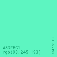 Цвет #5DF5C1 в цветовой модели RGB обозначается тремя октетами (93, 245, 193) в десятичном формате и #5DF5C1 в шестнадцатиричном (hex) формате, которые являются интенсивностью красного 93 (hex 5D), интенсивность зелёного 245 (hex F5) и интенсивность синего 193 (hex C1).