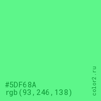 Цвет #5DF68A в цветовой модели RGB обозначается тремя октетами (93, 246, 138) в десятичном формате и #5DF68A в шестнадцатиричном (hex) формате, которые являются интенсивностью красного 93 (hex 5D), интенсивность зелёного 246 (hex F6) и интенсивность синего 138 (hex 8A).