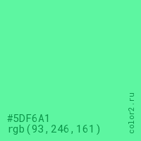 Цвет #5DF6A1 в цветовой модели RGB обозначается тремя октетами (93, 246, 161) в десятичном формате и #5DF6A1 в шестнадцатиричном (hex) формате, которые являются интенсивностью красного 93 (hex 5D), интенсивность зелёного 246 (hex F6) и интенсивность синего 161 (hex A1).