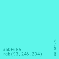 Цвет #5DF6EA в цветовой модели RGB обозначается тремя октетами (93, 246, 234) в десятичном формате и #5DF6EA в шестнадцатиричном (hex) формате, которые являются интенсивностью красного 93 (hex 5D), интенсивность зелёного 246 (hex F6) и интенсивность синего 234 (hex EA).