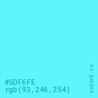 Цвет #5DF6FE в цветовой модели RGB обозначается тремя октетами (93, 246, 254) в десятичном формате и #5DF6FE в шестнадцатиричном (hex) формате, которые являются интенсивностью красного 93 (hex 5D), интенсивность зелёного 246 (hex F6) и интенсивность синего 254 (hex FE).