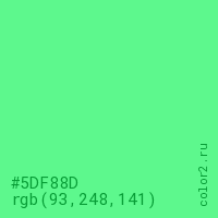 Цвет #5DF88D в цветовой модели RGB обозначается тремя октетами (93, 248, 141) в десятичном формате и #5DF88D в шестнадцатиричном (hex) формате, которые являются интенсивностью красного 93 (hex 5D), интенсивность зелёного 248 (hex F8) и интенсивность синего 141 (hex 8D).