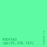 Цвет #5DFAA3 в цветовой модели RGB обозначается тремя октетами (93, 250, 163) в десятичном формате и #5DFAA3 в шестнадцатиричном (hex) формате, которые являются интенсивностью красного 93 (hex 5D), интенсивность зелёного 250 (hex FA) и интенсивность синего 163 (hex A3).