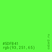 Цвет #5DFB41 в цветовой модели RGB обозначается тремя октетами (93, 251, 65) в десятичном формате и #5DFB41 в шестнадцатиричном (hex) формате, которые являются интенсивностью красного 93 (hex 5D), интенсивность зелёного 251 (hex FB) и интенсивность синего 65 (hex 41).