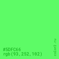 Цвет #5DFC66 в цветовой модели RGB обозначается тремя октетами (93, 252, 102) в десятичном формате и #5DFC66 в шестнадцатиричном (hex) формате, которые являются интенсивностью красного 93 (hex 5D), интенсивность зелёного 252 (hex FC) и интенсивность синего 102 (hex 66).