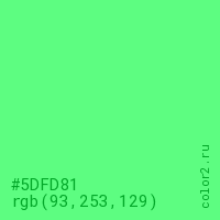 Цвет #5DFD81 в цветовой модели RGB обозначается тремя октетами (93, 253, 129) в десятичном формате и #5DFD81 в шестнадцатиричном (hex) формате, которые являются интенсивностью красного 93 (hex 5D), интенсивность зелёного 253 (hex FD) и интенсивность синего 129 (hex 81).