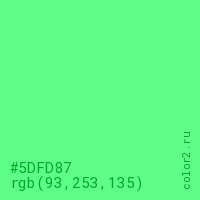 Цвет #5DFD87 в цветовой модели RGB обозначается тремя октетами (93, 253, 135) в десятичном формате и #5DFD87 в шестнадцатиричном (hex) формате, которые являются интенсивностью красного 93 (hex 5D), интенсивность зелёного 253 (hex FD) и интенсивность синего 135 (hex 87).
