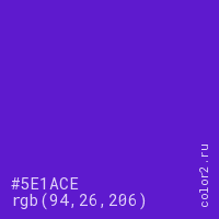 Цвет #5E1ACE в цветовой модели RGB обозначается тремя октетами (94, 26, 206) в десятичном формате и #5E1ACE в шестнадцатиричном (hex) формате, которые являются интенсивностью красного 94 (hex 5E), интенсивность зелёного 26 (hex 1A) и интенсивность синего 206 (hex CE).