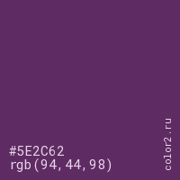 Цвет #5E2C62 в цветовой модели RGB обозначается тремя октетами (94, 44, 98) в десятичном формате и #5E2C62 в шестнадцатиричном (hex) формате, которые являются интенсивностью красного 94 (hex 5E), интенсивность зелёного 44 (hex 2C) и интенсивность синего 98 (hex 62).