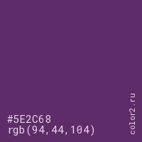 Цвет #5E2C68 в цветовой модели RGB обозначается тремя октетами (94, 44, 104) в десятичном формате и #5E2C68 в шестнадцатиричном (hex) формате, которые являются интенсивностью красного 94 (hex 5E), интенсивность зелёного 44 (hex 2C) и интенсивность синего 104 (hex 68).