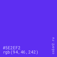 Цвет #5E2EF2 в цветовой модели RGB обозначается тремя октетами (94, 46, 242) в десятичном формате и #5E2EF2 в шестнадцатиричном (hex) формате, которые являются интенсивностью красного 94 (hex 5E), интенсивность зелёного 46 (hex 2E) и интенсивность синего 242 (hex F2).