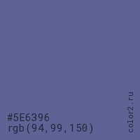 Цвет #5E6396 в цветовой модели RGB обозначается тремя октетами (94, 99, 150) в десятичном формате и #5E6396 в шестнадцатиричном (hex) формате, которые являются интенсивностью красного 94 (hex 5E), интенсивность зелёного 99 (hex 63) и интенсивность синего 150 (hex 96).